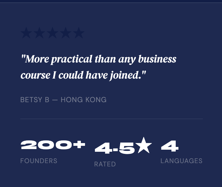 Chaque étape dure entre 2 et 4 heures et enseigne une compétence fondamentale pour la création d'entreprise, de la validation de votre idée au lancement de votre premier produit. À votre rythme, structuré et conçu pour une application réelle.