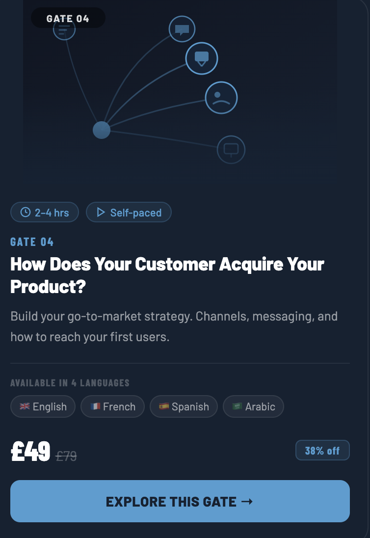 Chaque module dure entre 2 et 4 heures et aborde une compétence essentielle pour les start-ups, de la validation de votre idée au lancement de votre premier produit. Ces modules, que vous pouvez suivre à votre rythme, sont structurés et s'appuient sur le cadre « Disciplined Entrepreneurship » du MIT.