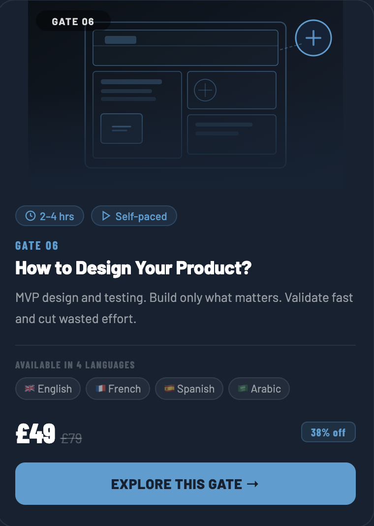 Chaque module se termine par un projet de portfolio : un véritable produit que vous créez pour votre propre entreprise. Une fois les 10 étapes franchies, vous disposez d'un portfolio de fondateur qui démontre vos compétences aux investisseurs, aux cofondateurs et aux employeurs.